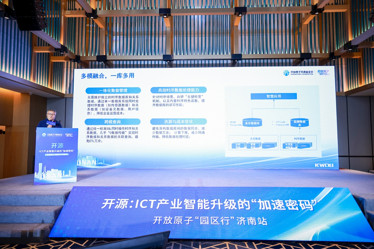 浪潮KaiwuDB 数据平台总经理金宁博士作为 KWDB 项目共建方及运营方代表受邀到场,并在《KWDB 数据库——加速赋能 AIoT,共建开源数据生态》主题分享中表示,KWDB 以高性能时序引擎、多模融合、分布式及 AI 赋能四大关键特性,破解物联网实时数据管理难题:1)支持海量设备并发连接,时序数据写入性能达百万级 TPS,满足工业物联网、智慧能源等场景的高频数据采集需求;2)支持亿级数据量秒级响应,支撑智慧交管、数字政务场景实时决策与智能分析;3)自动降采样与冷热数据分层存储,存储成本指数级下降;4)支持边缘计算节点部署,数据就近处理,降低网络传输延迟,提升系统整体效率;5)支持 AI 算法,拥有MCP Server、智能体等大模型生态工具,助力企业轻松运维管理。